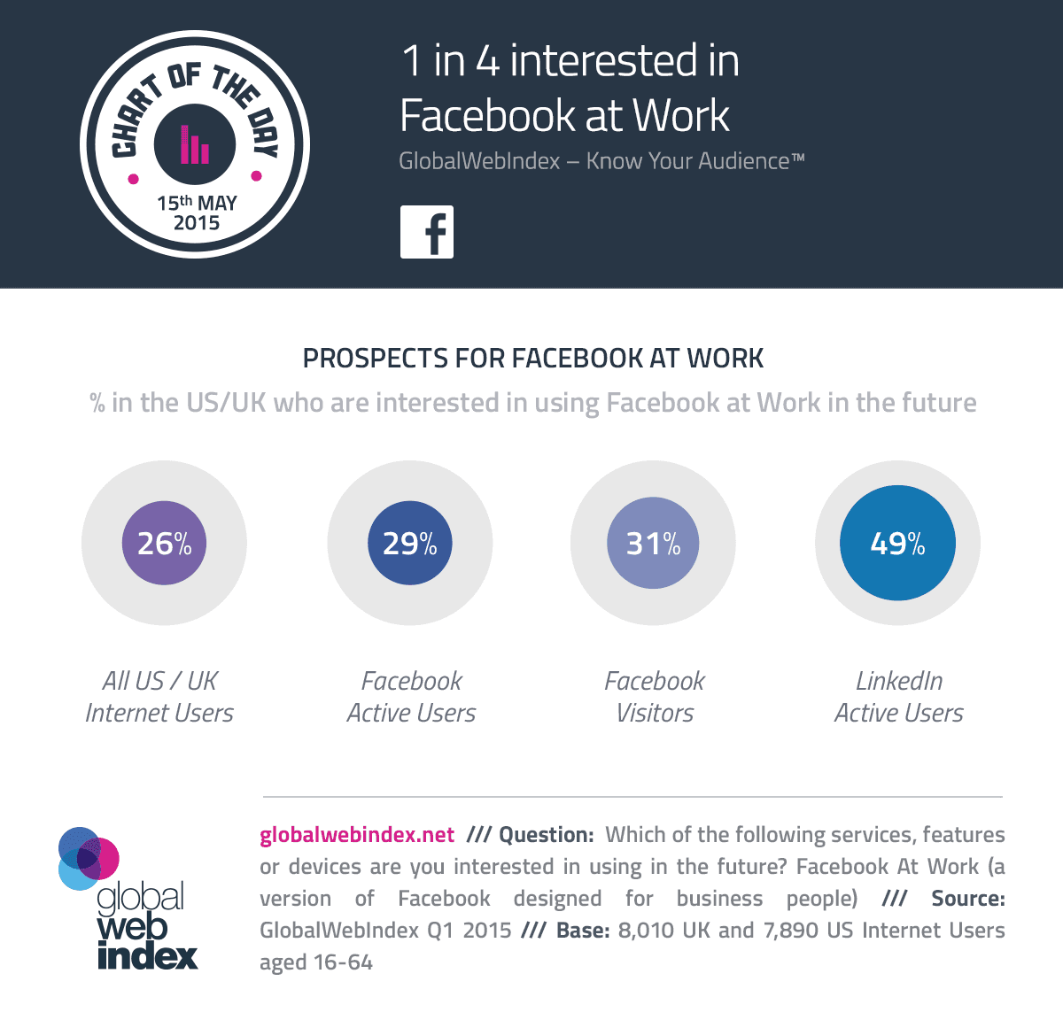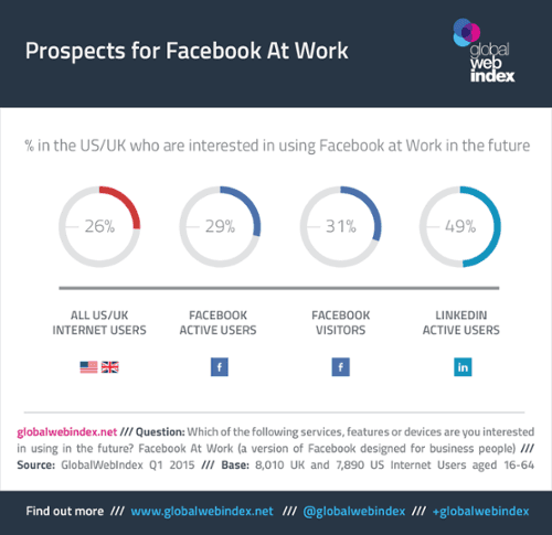 Facebook at Work is an attempt to re-engage existing users who may have started using other platforms. The prospects for it look good with a quarter of users expressing interest in using it. It may even succeed at moving some LinkedIn users away from that platform.