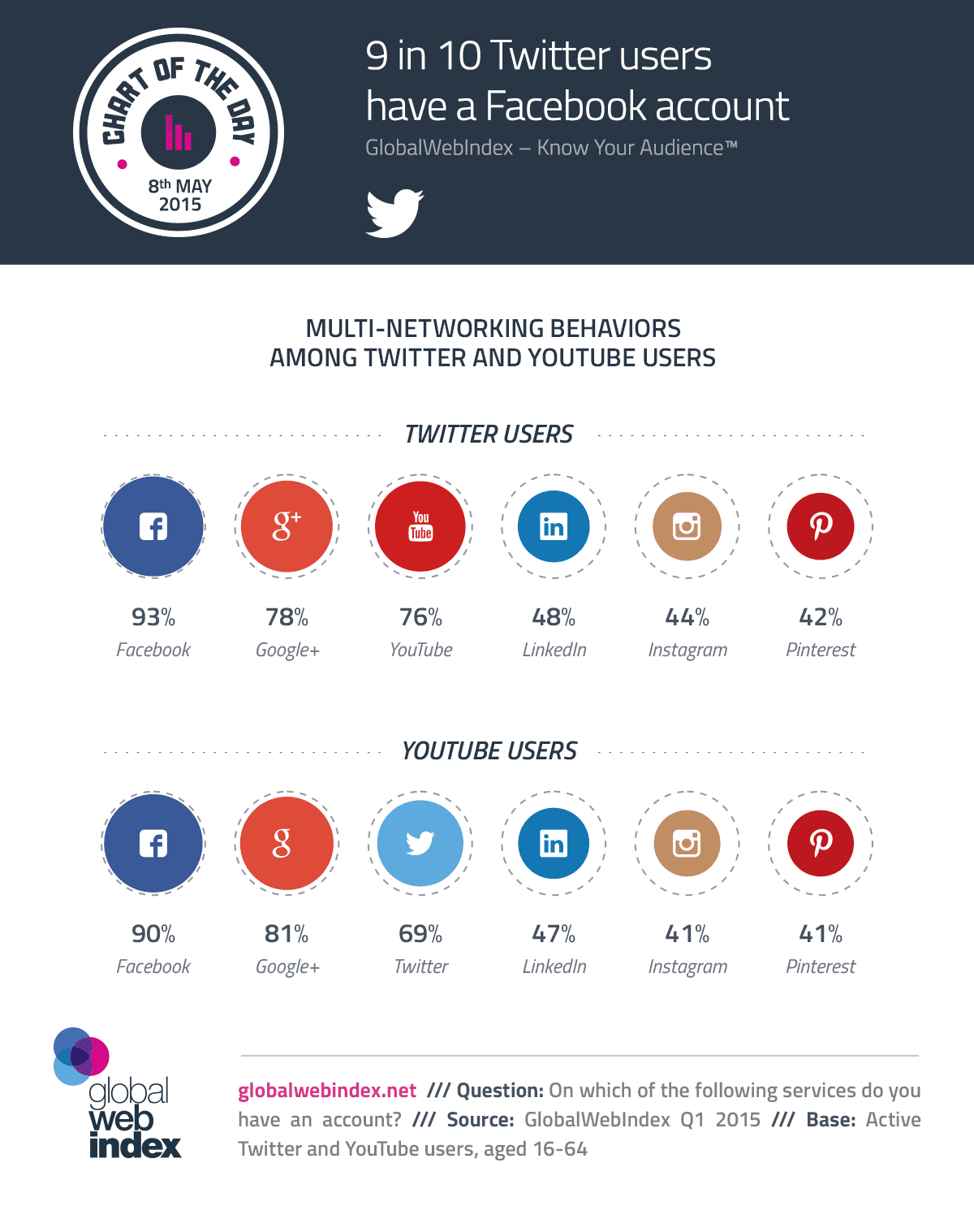 9 out of 10 Twitter and YouTube users also have a presence on Facebook. Compared to this only 40% of Twitter and YouTube users use Pinterest as well.