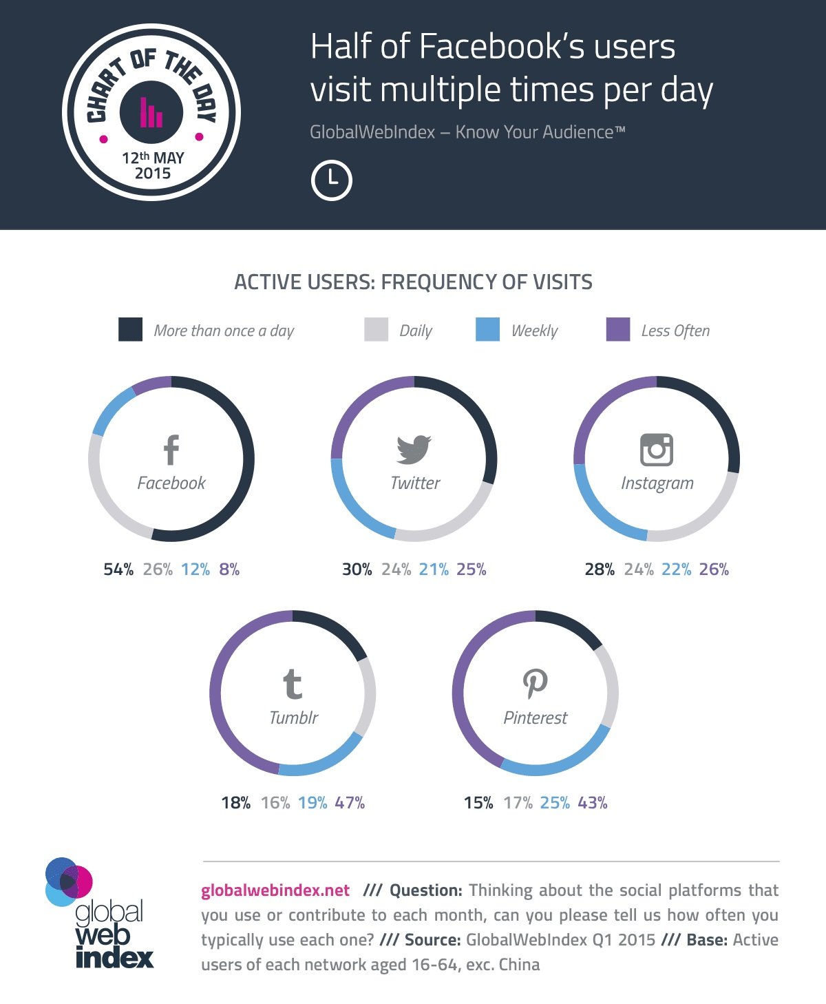 More than half of Facebook users visit the platform more than once per day which is more than any other social media platform. This even though it has seen a drop in active usage over the past year. Twitter takes the runner up spot.