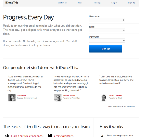 iDoneThis The iDoneThis home page also has a number of elements working for it such as the use of whitespace, use of testimonials and focus on getting people to sign up for a trial for a free via the short yet visible sign up form.