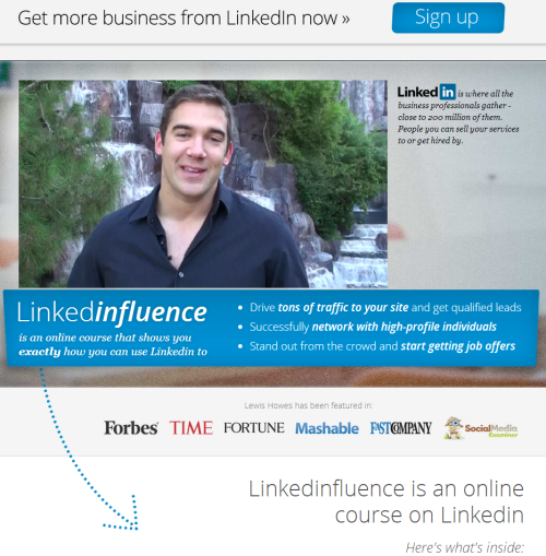 Linkedinfluence The Linkedinfluence page is a sales page that uses long form copy. You can view the entire sales page here. Lewis Howes uses a video, clear copy that explains the benefits, social proof, great use of imagery to show what people can expect, testimonials all of which lead to the Add to Cart button towards the end of the page. The 60 day no questions asked money back guarantee also helps assure prospective customers (try for free incentive).