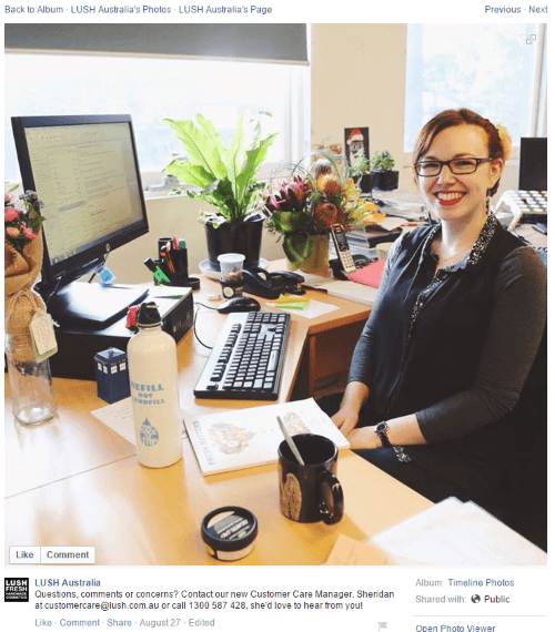 This post by LUSH cosmetics introducing their new customer care manager is just such an example with likes and comments.