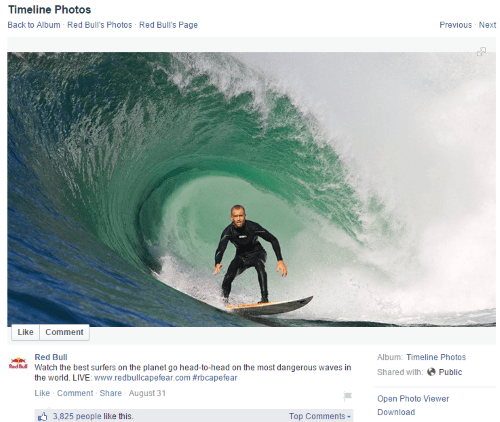 Simply Measured analysed Red Bull’s social media posts and found that photos only account for 5% of their posts. However in terms of engagement it delivered 90% of their interactions on Twitter and Facebook. Red Bull has built a brand around sponsoring and supporting extreme sports. So images that relate to this resonate with their audience like this post on their Facebook page.